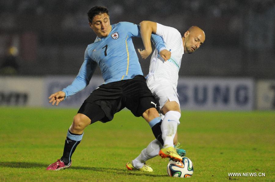 Uruguay's Cristian Rodriguez (L) vies for the ball with Slovenia's Miso Brecko during a friendly match prior to the 2014 FIFA World Cup, held at the Centenario Stadium, in Montevideo, capital of Uruguay, on June 4, 2014. (Xinhua/Nicolas Celaya)