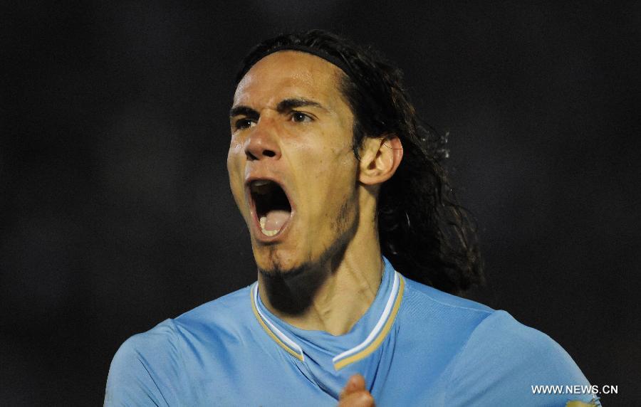 Uruguay's Edinson Cavani celebrates after scoring during a friendly match against Slovenia, prior to the 2014 FIFA World Cup, held at the Centenario Stadium, in Montevideo, capital of Uruguay, on June 4, 2014. (Xinhua/Nicolas Celaya)