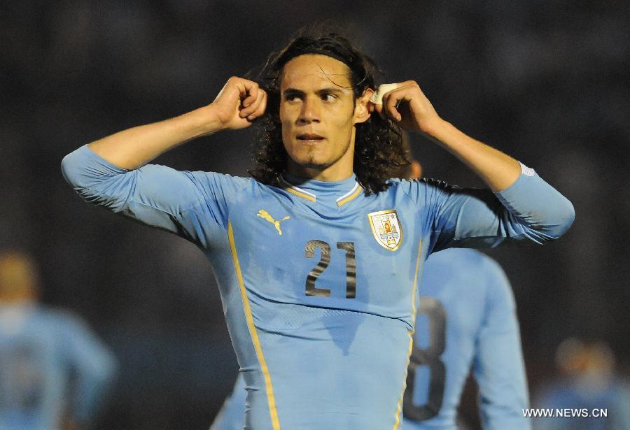 Uruguay's Edinson Cavani celebrates after scoring during a friendly match against Slovenia, prior to the 2014 FIFA World Cup, held at the Centenario Stadium, in Montevideo, capital of Uruguay, on June 4, 2014. (Xinhua/Nicolas Celaya)