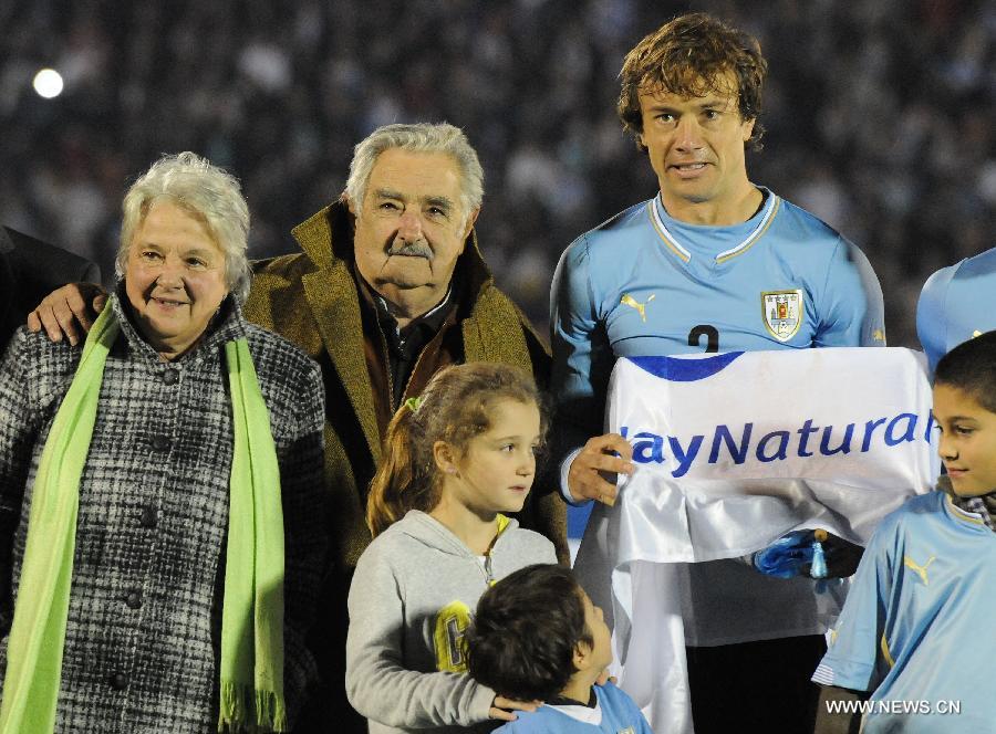 Uruguay's President Jose Mujica (2nd L) and Uruguay's Diego Lugano (2nd R) pose for photograph during a friendly match against Slovenia, prior to the 2014 FIFA World Cup, held at the Centenario Stadium, in Montevideo, capital of Uruguay, on June 4, 2014. (Xinhua/Nicolas Celaya) |