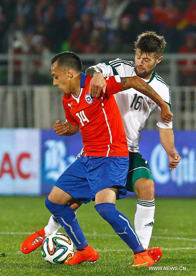 Chile's Fabian Orellana (L) vies for the ball with Oliver Norwood of Northern Ireland during a friendly match prior to the 2014 FIFA World Cup, held at Elias Figueroa Brander Stadium, in Valparaiso, Chile, on June 4, 2014. (Xinhua/Str)