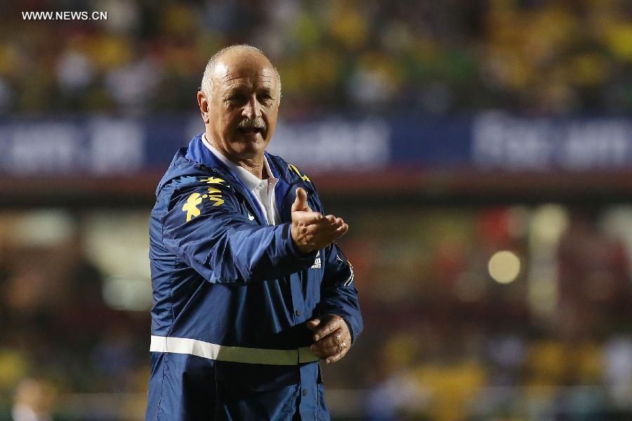 Brazil's head coach Luiz Felipe Scolari reacts during the friendly match against Serbia previous to the FIFA World Cup held on the Morumbi Stadium in Sao Paulo, Brazil, on June 6, 2014. (Xinhua/Rahel Patrasso)