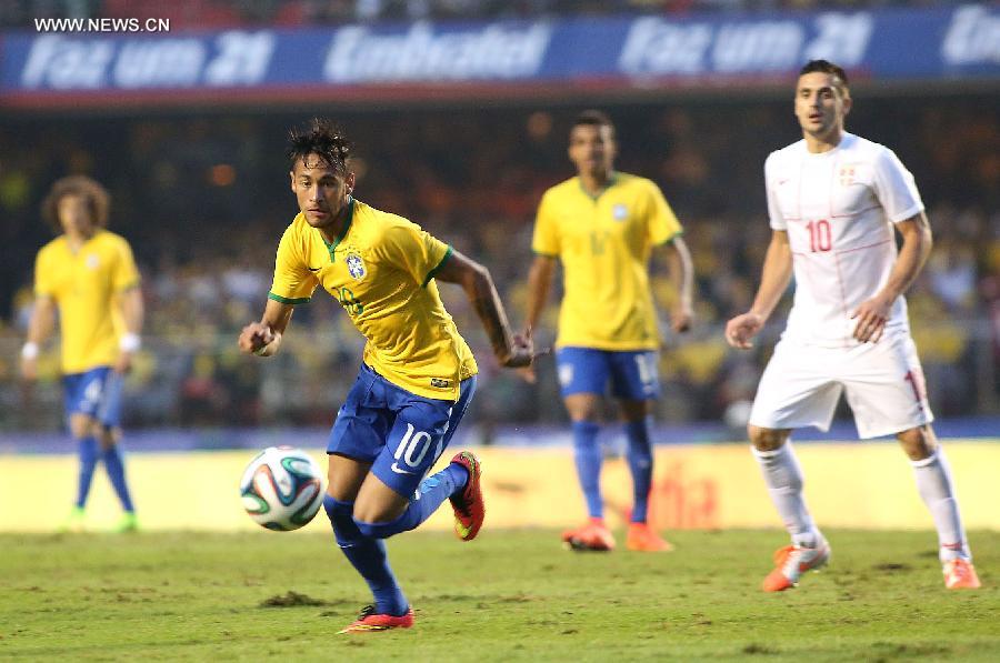 Brazil's Neymar controls the ball during the friendly match against Serbia previous to the FIFA World Cup held on the Morumbi Stadium in Sao Paulo, Brazil, on June 6, 2014. (Xinhua/Rahel Patrasso)