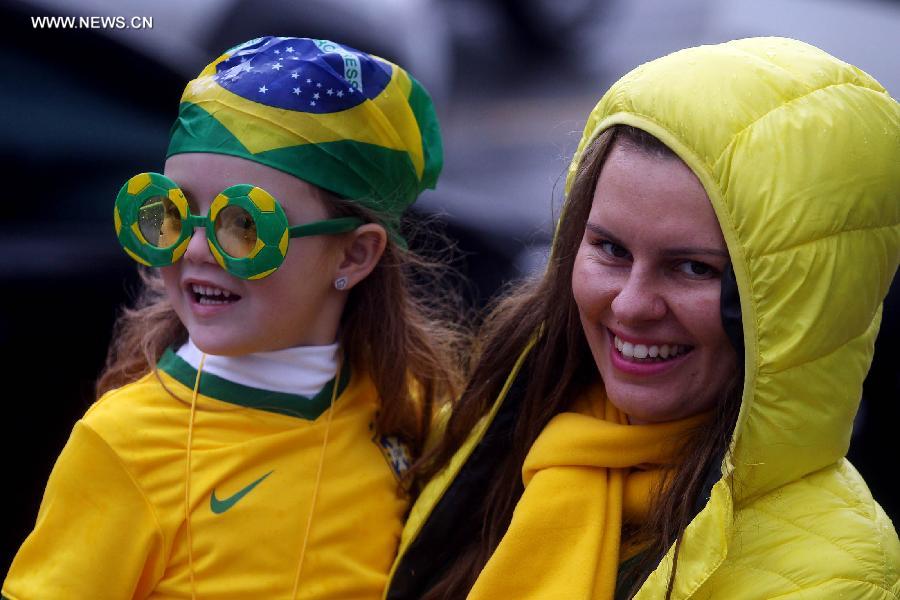 Fans of Brazil's national soccer team react before the friendly match against Serbia previous to the FIFA World Cup held on the Morumbi Stadium in Sao Paulo, Brazil, on June 6, 2014. (Xinhua/Felipe Rau/AGENCIA ESTADO)