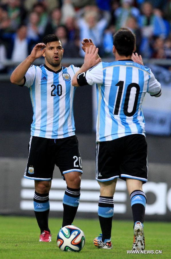 Argentina's Lionel Messi (R), celebrates after scoring with his teammate Sergio Aguero during the friendly match against Slovenia prior to the FIFA World Cup at Ciudad de La Plata Stadium, in La Plata, Argentina, on June 7, 2014. (Xinhua/Victor Carreira/TELAM) |