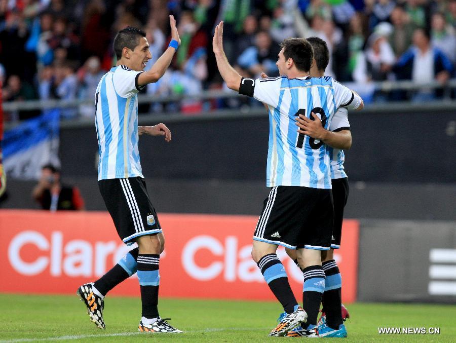 Argentina's Lionel Messi (C) celebrates after scoring with his teammates Sergio Aguero (R) and Angel Di Maria during the friendly match against Slovenia prior to the FIFA World Cup at Ciudad de La Plata Stadium, in La Plata, Argentina, on June 7, 2014. (Xinhua/Victor Carreira/TELAM) |