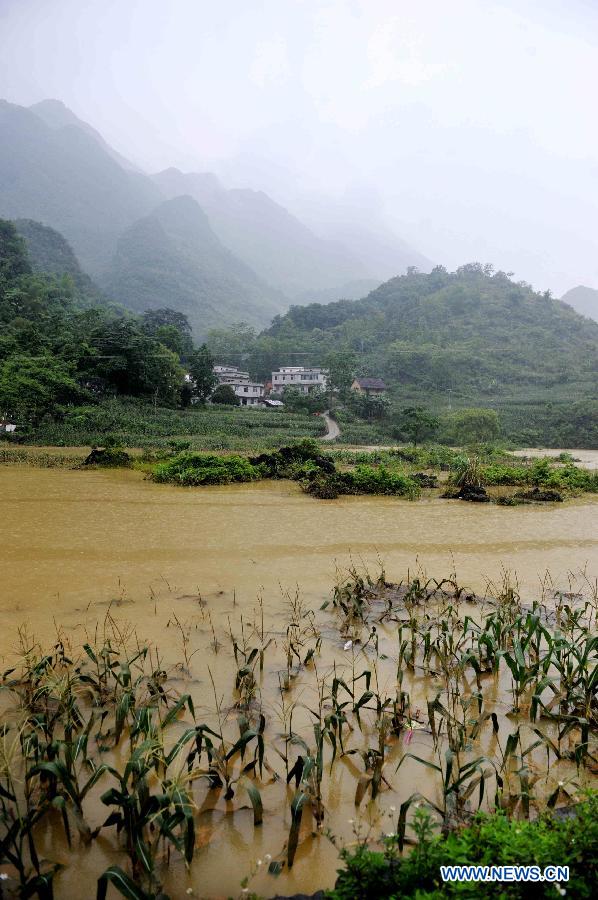 Photo taken on June 9, 2014 shows the flooded Banlie Village of Bansheng Township in Dahua Yao Autonomous County in Hechi City, south China's Guangxi Zhuang Autonomous Region. Heavy rain hit parts of Guangxi Zhuang Autonomous Region, flooding streets and causing damages.(Xinhua/Zhang Ailin)