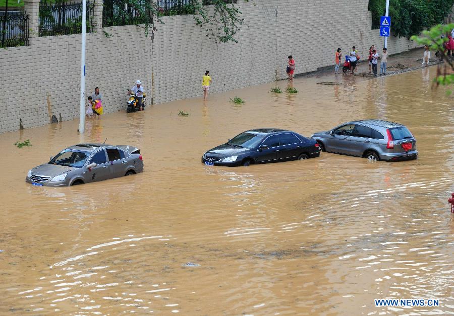 Cars are submerged by flood in Nanning, capital of south China's Guangxi Zhuang Autonomous Region, June 9, 2014. Heavy rain hit parts of Guangxi Zhuang Autonomous Region, flooding streets and causing damages.(Xinhua/Huang Xiaobang)