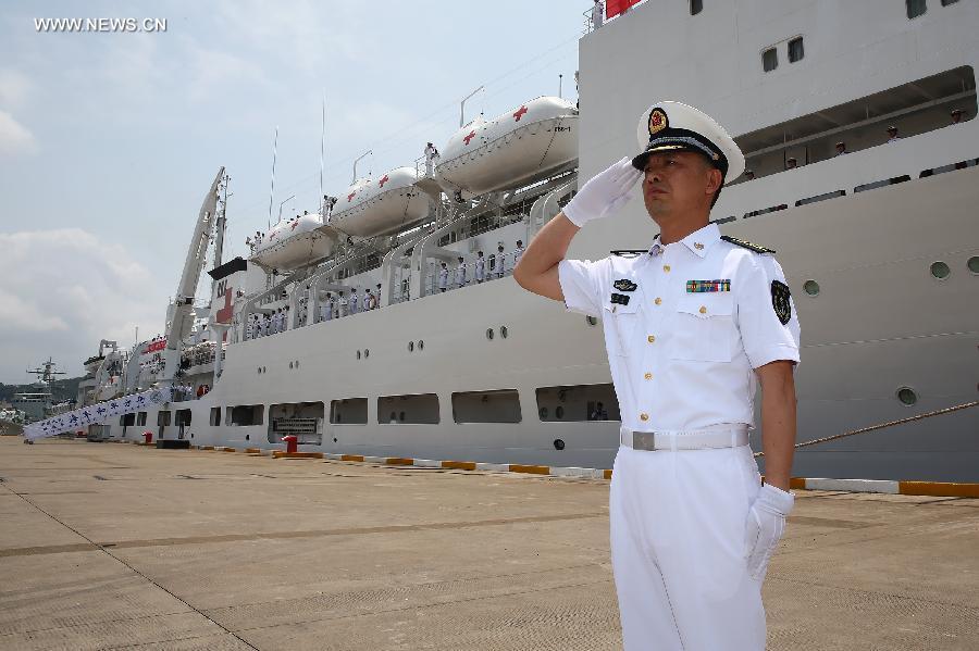 Zhang Ronghua, captain of China's hospital ship Peace Ark, prepares for sailing at a naval port in Zhoushan, east China's Zhejiang Province, June 9, 2014. The Chinese navy will participate in the Rim of the Pacific (RIMPAC) multinational naval exercises for the first time. A missile destroyer, a missile frigate, a supplier ship and a hospital ship of the Chinese navy left for the United States on Monday to attend the exercises. (Xinhua/Ju Zhenhua) |