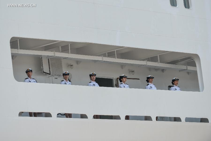 Soldiers are seen aboard China's hospital ship Peace Ark at a naval port in Zhoushan, east China's Zhejiang Province, June 9, 2014. The Chinese navy will participate in the Rim of the Pacific (RIMPAC) multinational naval exercises for the first time. A missile destroyer, a missile frigate, a supplier ship and a hospital ship of the Chinese navy left for the United States on Monday to attend the exercises. (Xinhua/Qin Haishi) |
