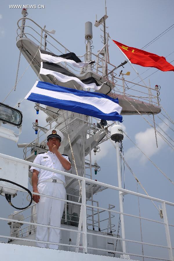 A soldier blows a whisle aboard China's hospital ship Peace Ark at a naval port in Zhoushan, east China's Zhejiang Province, June 9, 2014. The Chinese navy will participate in the Rim of the Pacific (RIMPAC) multinational naval exercises for the first time. A missile destroyer, a missile frigate, a supplier ship and a hospital ship of the Chinese navy left for the United States on Monday to attend the exercises. (Xinhua/Ju Zhenhua) |