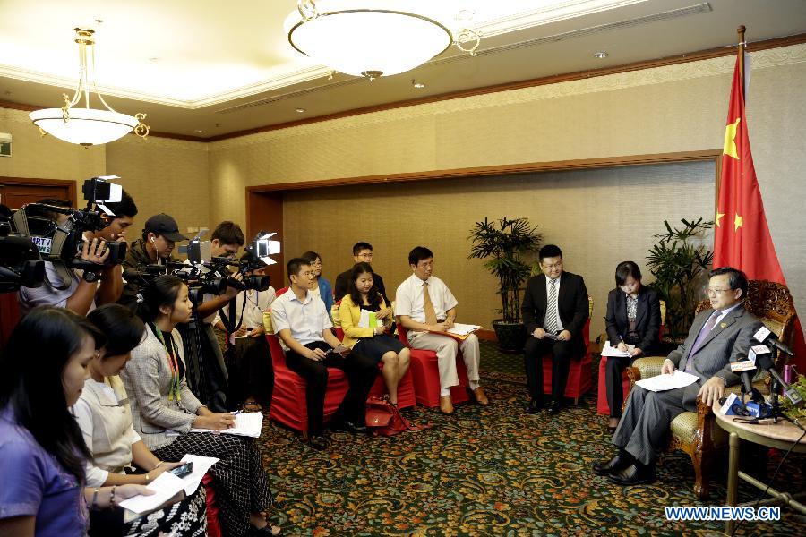 Chinese Vice Foreign Minister Liu Zhenmin (1st, R) speaks to media at a joint interview in Yangon, Myanmar, June 9, 2014. China will firmly support ASEAN's development, its community building and centrality in regional cooperation, and is also committed to growing a healthy, stable and dynamic China-ASEAN relationship, Chinese Vice Foreign Minister Liu Zhenmin told the press here Monday in a joint interview made by mediapersons from China and Myanmar. (Xinhua/U Aung) |