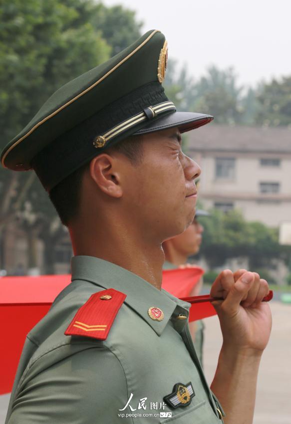 On June 7, more than 20 soldiers take part in training at Nanjing detachment of People's Armed Police Corps. The soldiers, with an average height of 183 cm and weight between 73 and 75 kg, were selected from about 3,000 soldiers to perform the flag-raising task at the opening and closing ceremonies of the Youth Olympic Games (YOG). (People .com. cn/Photo) |