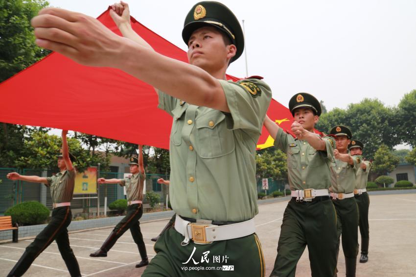 On June 7, more than 20 soldiers take part in training at Nanjing detachment of People's Armed Police Corps. The soldiers, with an average height of 183 cm and weight between 73 and 75 kg, were selected from about 3,000 soldiers to perform the flag-raising task at the opening and closing ceremonies of the Youth Olympic Games (YOG). (People .com. cn/Photo)