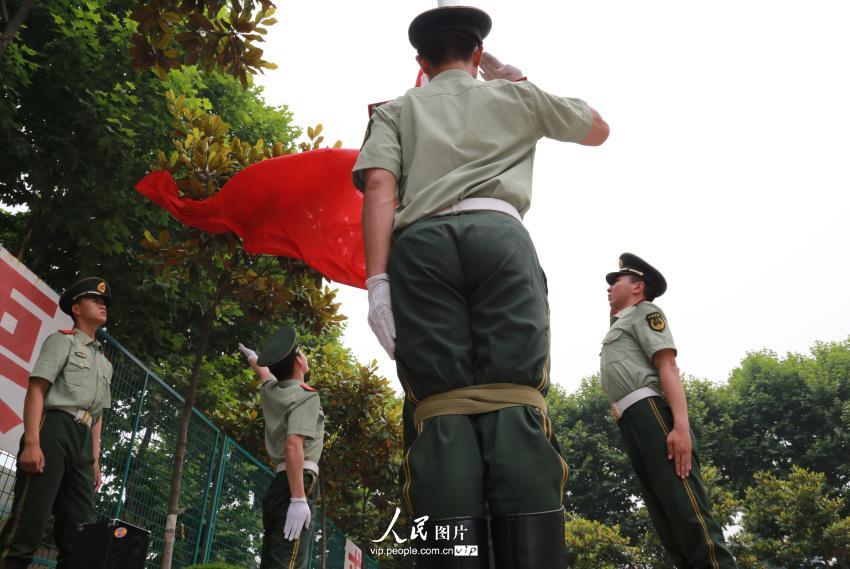 On June 7, more than 20 soldiers take part in training at Nanjing detachment of People's Armed Police Corps. The soldiers, with an average height of 183 cm and weight between 73 and 75 kg, were selected from about 3,000 soldiers to perform the flag-raising task at the opening and closing ceremonies of the Youth Olympic Games (YOG). (People .com. cn/Photo)