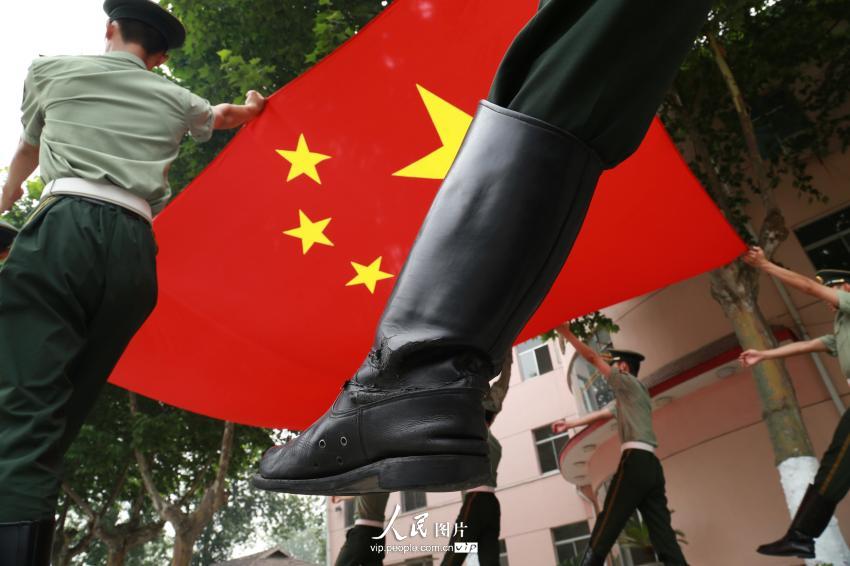 On June 7, more than 20 soldiers take part in training at Nanjing detachment of People's Armed Police Corps. The soldiers, with an average height of 183 cm and weight between 73 and 75 kg, were selected from about 3,000 soldiers to perform the flag-raising task at the opening and closing ceremonies of the Youth Olympic Games (YOG). (People .com. cn/Photo)