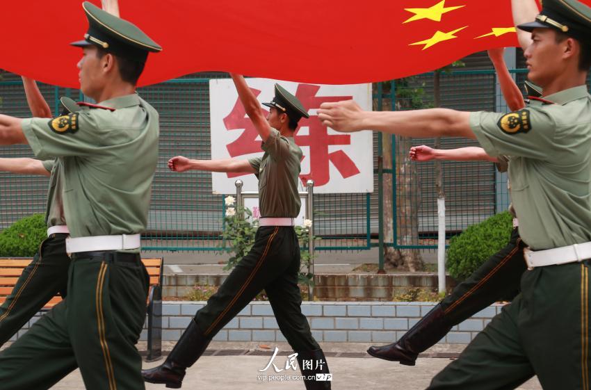 On June 7, more than 20 soldiers take part in training at Nanjing detachment of People's Armed Police Corps. The soldiers, with an average height of 183 cm and weight between 73 and 75 kg, were selected from about 3,000 soldiers to perform the flag-raising task at the opening and closing ceremonies of the Youth Olympic Games (YOG). (People .com. cn/Photo)