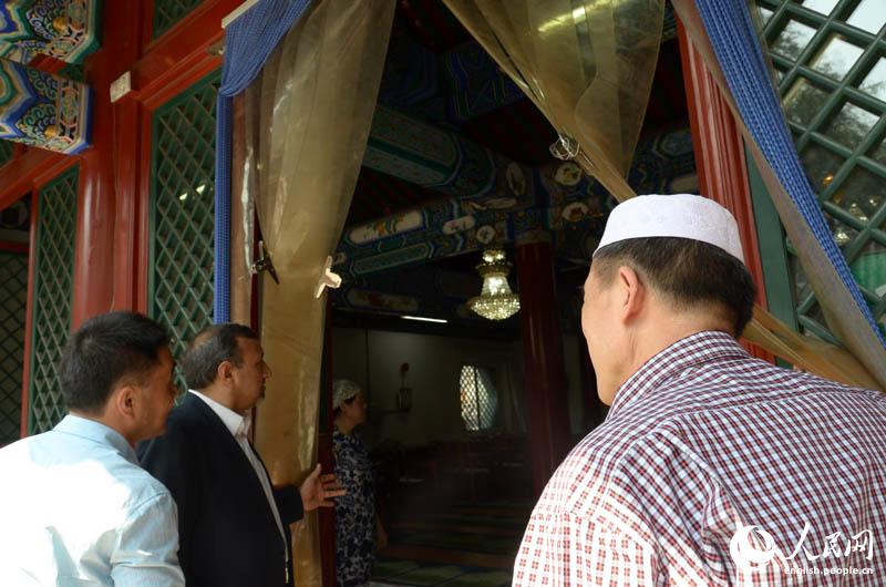 Wei Chunjie (right), director of the Niujie Mosque, introduces the Female Mosque to Cultural Counselor of the Embassy of Iran in China Hossein Jalivand (2nd left), June 3, 2014.