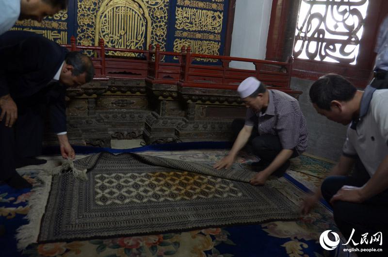 Cultural Counselor of the Embassy of Iran in China Hossein Jalivand (left) looks at the prayer carpet in the main prayer hall of Niujie Mosque, June 3, 2014. (People's Daily Online/Du Mingming)