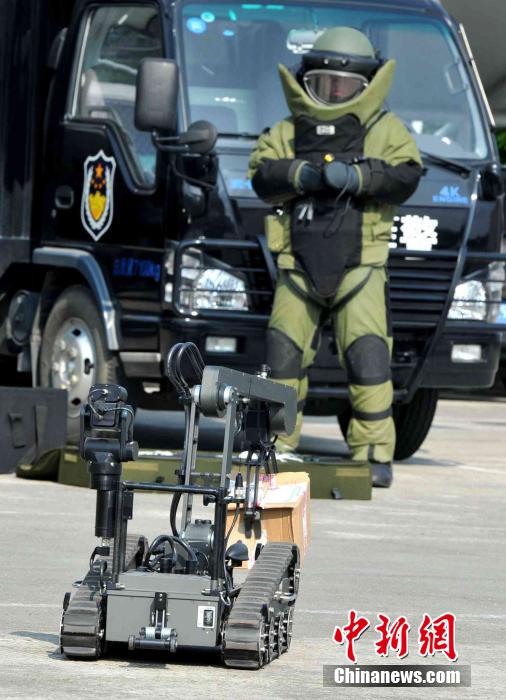 A SWAT team conducts anti-terror drill in Fuzhou, southeast China’s Fujian province on June 9, 2014. They demonstrated skills including emergency response, explosive handling, bomb disposal, search and shooting. Established in 2005, the team has 281 members with average age of 26.3 years old. (CNS Photo/Wang Dongming)
