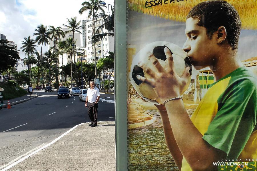 A man looks on an advertisement of Brazil World Cup, in Salvador Bahia, June 10 2014. The World Cup 2014 will be held in Brazil from 12 June to 13 July. (Xinhua/Jhon Paz)