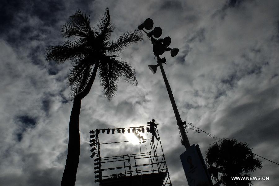 Men work on preparations for the transmission of the inauguration of the World Cup near of the beach in salvador Bahia, June 10 2014. The World Cup 2014 will be held in Brazil from 12 June to 13 July. (Xinhua/Jhon Paz)