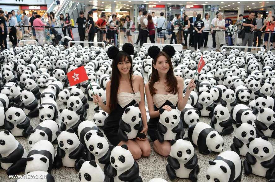 Two models pose with paper pandas at Hong Kong International Airport in Hong Kong, South China, June 9, 2014. The installation arrived in the city on Monday, launching the month-long "1600 Pandas World Tour in Hong Kong: Creativity meets Conservation" organized by a local art organiser, according to the official press release. [Photo/Xinhua] |