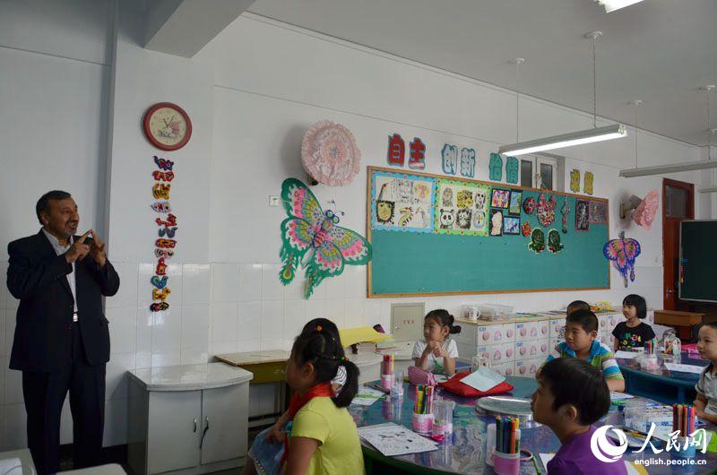 Hossein Jalivand (left), Cultural Counselor of the Embassy of Iran in China, talks with students in Huimin Primary School, June 3, 2014. (People's Daily Online/Du Mingming)