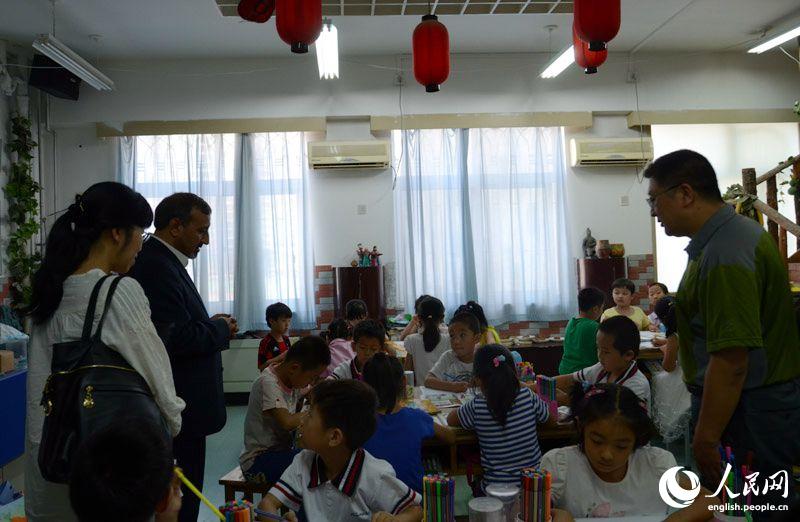 Hossein Jalivand (2nd left), Cultural Counselor of the Embassy of Iran in China, talks with students in Huimin Primary School, June 3, 2014. (People's Daily Online/Du Mingming)