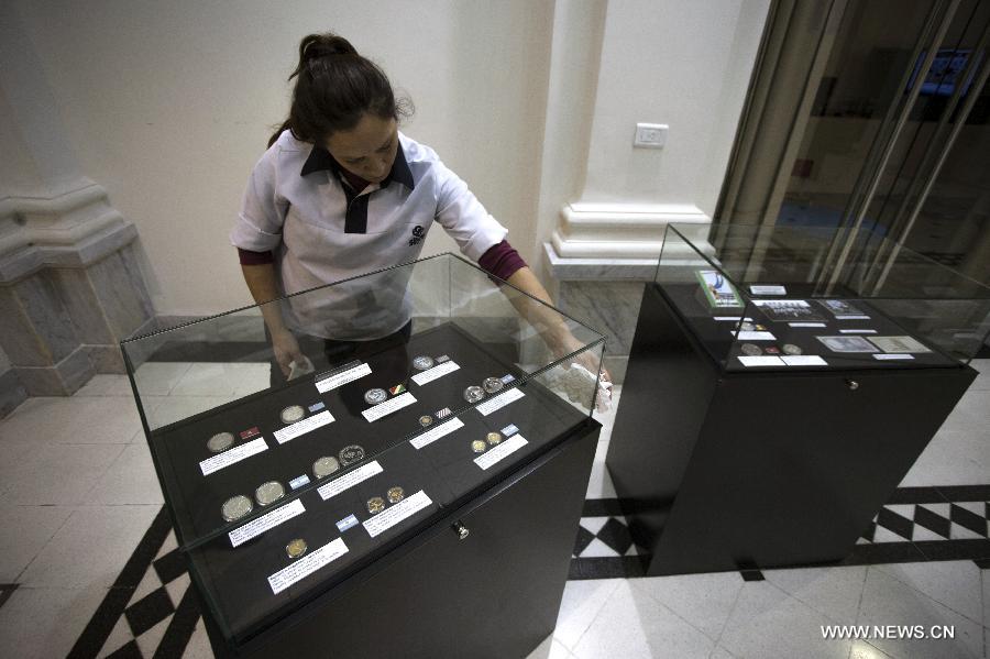 An employee cleans a cabinet where conmemorative coins of World Cups are displayed during the opening of the Soccer World Championships exhibition at the Historical and Numismatic Museum of the Central Bank of Argentina, in Buenos Aires, Argentina, on June 11, 2014. At the opening ceremony, the conmemorative coin of the 2014 FIFA World Cup was presented, struck in silver "proof", special stamp used for collectibles, value of 5 Argenine pesos. (Xinhua/Martin Zabala) |