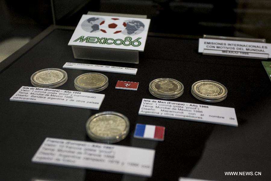 Conmemorative coins of World Cups are displayed during the opening of the Soccer World Championships exhibition at the Historical and Numismatic Museum of the Central Bank of Argentina, in Buenos Aires, Argentina, on June 11, 2014. At the opening ceremony, the conmemorative coin of the 2014 FIFA World Cup was presented, struck in silver "proof", special stamp used for collectibles, value of 5 Argenine pesos. (Xinhua/Martin Zabala) |