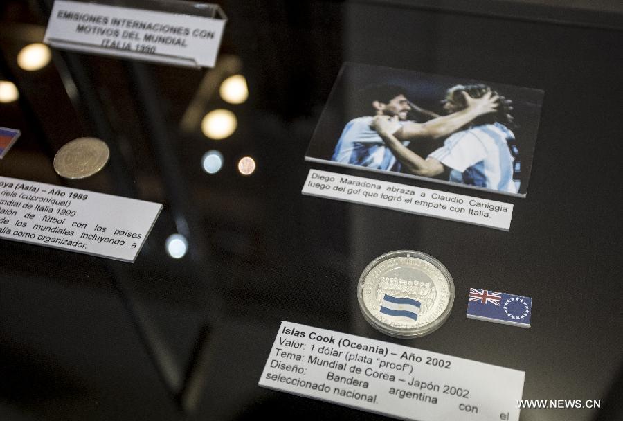 Conmemorative coins of World Cups are displayed during the opening of the Soccer World Championships exhibition at the Historical and Numismatic Museum of the Central Bank of Argentina, in Buenos Aires, Argentina, on June 11, 2014. At the opening ceremony, the conmemorative coin of the 2014 FIFA World Cup was presented, struck in silver "proof", special stamp used for collectibles, value of 5 Argenine pesos. (Xinhua/Martin Zabala) |