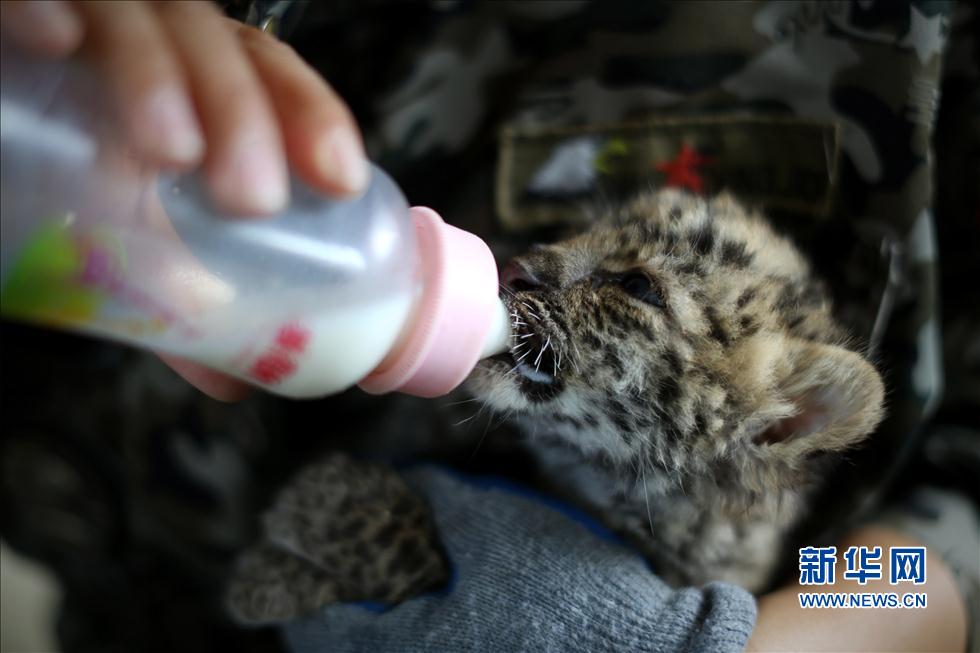 A staff feeds a one-month-old leopard cub at the Shenyang Forest Wildlife Zoo in Shenyang, Liaoning on June 7, 2014. (Yao Jianfeng/Xinhua News Agency)