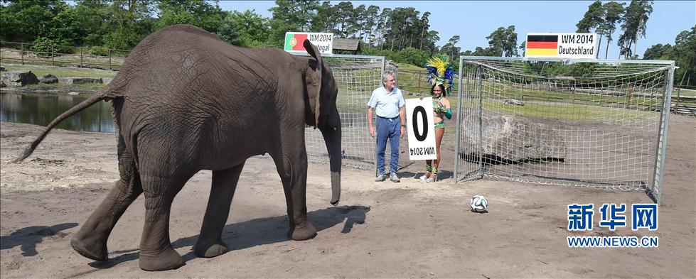Elephant Nelly plays with a World Cup football at Serengeti Park in Hodenhagen, Germany on June 4, 2014. Nelly predicted a victory for Portugal over Germany during the group match of the World Cup by kicking the ball into the Portuguese goal. (Xinhua News Agency/AFP) |