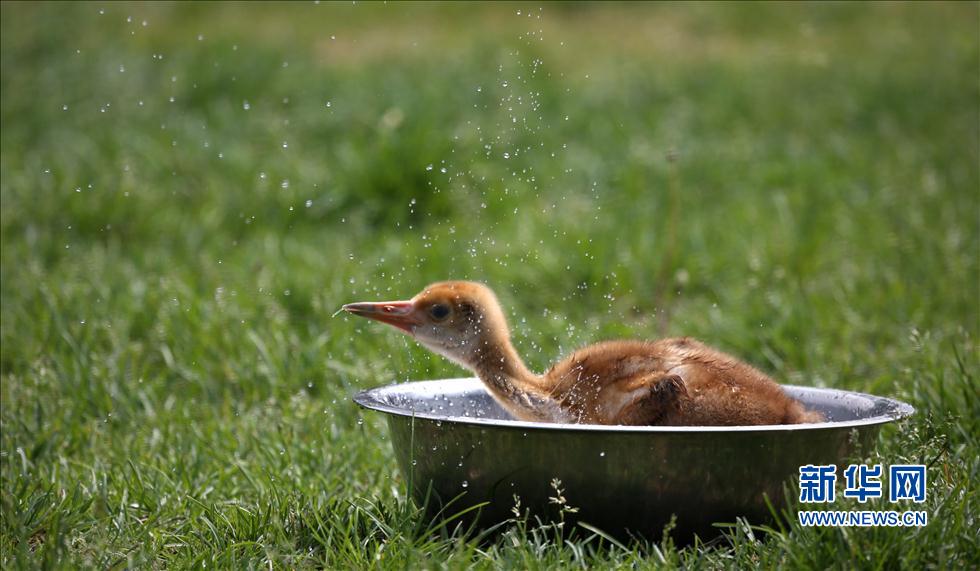 A red-crowned crane takes a shower outdoors on June 7, 2014. (Yao Jianfeng/Xinhua News Agency)