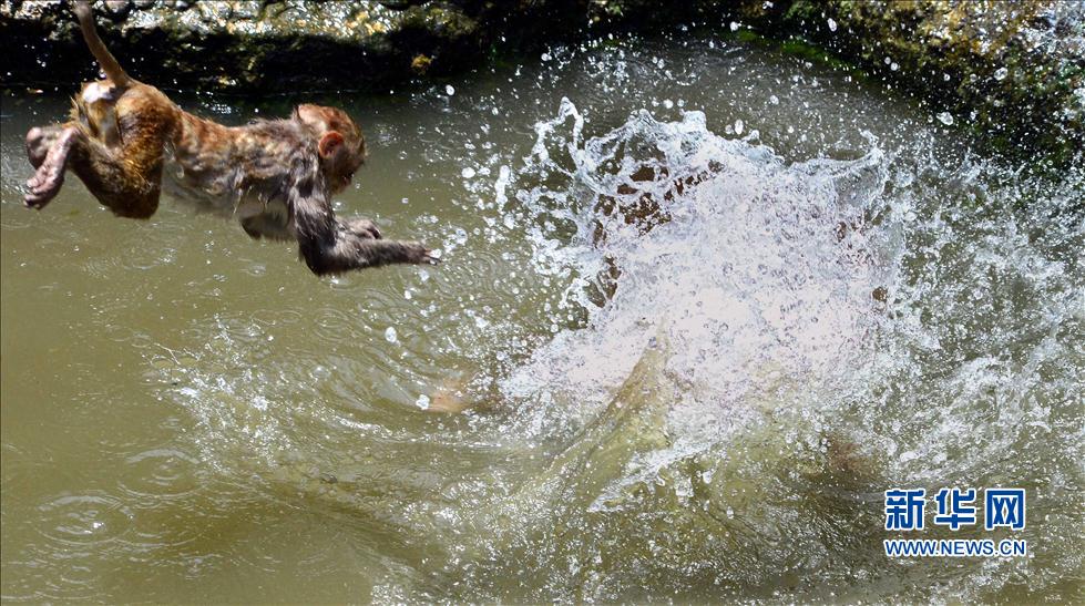 A little monkey jumps into water on May 29, 2014. (Wang Song/Xinhua News Agency)