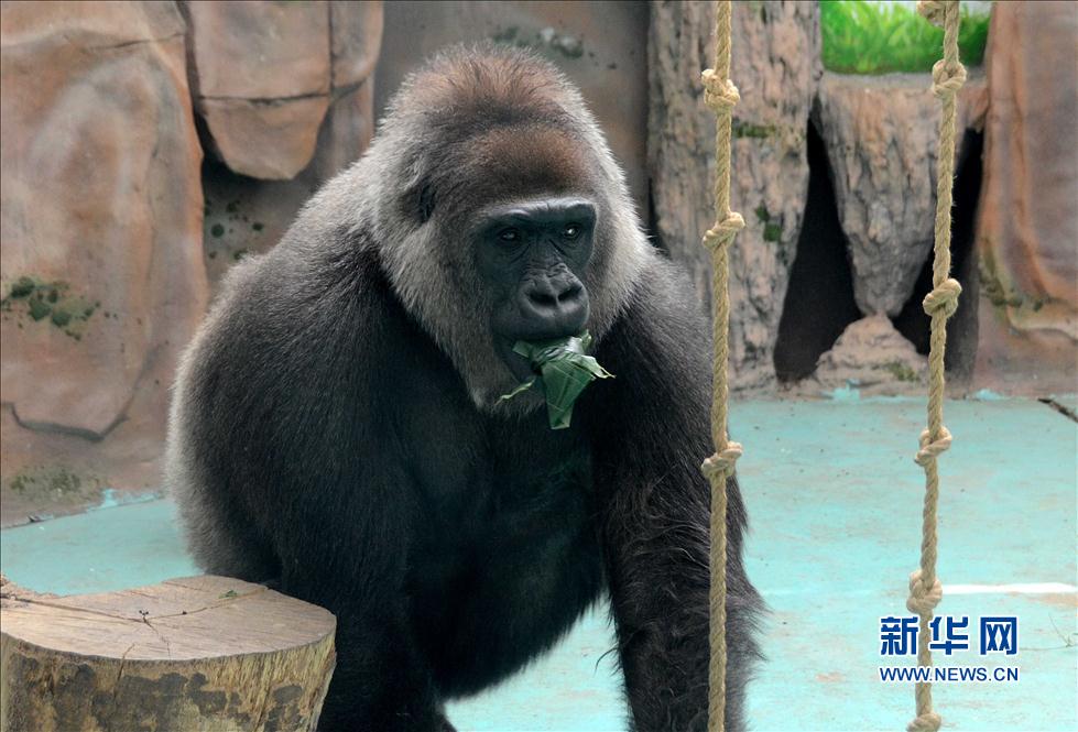 A gorilla eats a special dumpling with Chinese date, pineapple and apple at animal zoo in Zhengzhou, Henan on May 28, 2013. (Li An/Xinhua News Agency)