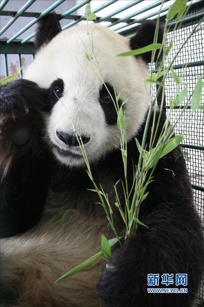 A panda named "Qing Feng" has breakfast at Yantai Zoo in Yantai City, east China's Shandong Province on June 10, 2014. The zoo splashed water for the two pandas "Qing Feng" and "Hua Ao" to keep them cool as the highest temperature in Yantai reached 29 Celsius degrees Saturday. (Shen Zhongji/Xinhua News Agency) |