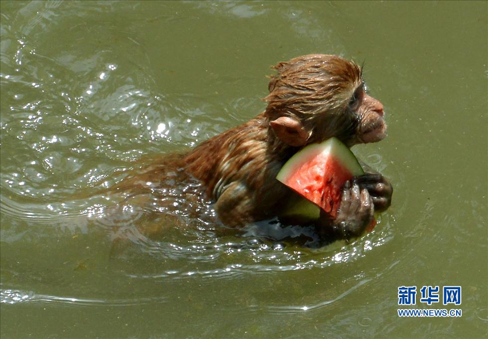 A little monkey holds a piece of watermelon to swim in the water on May 29, 2014. (Wang Song/Xinhua News Agency)