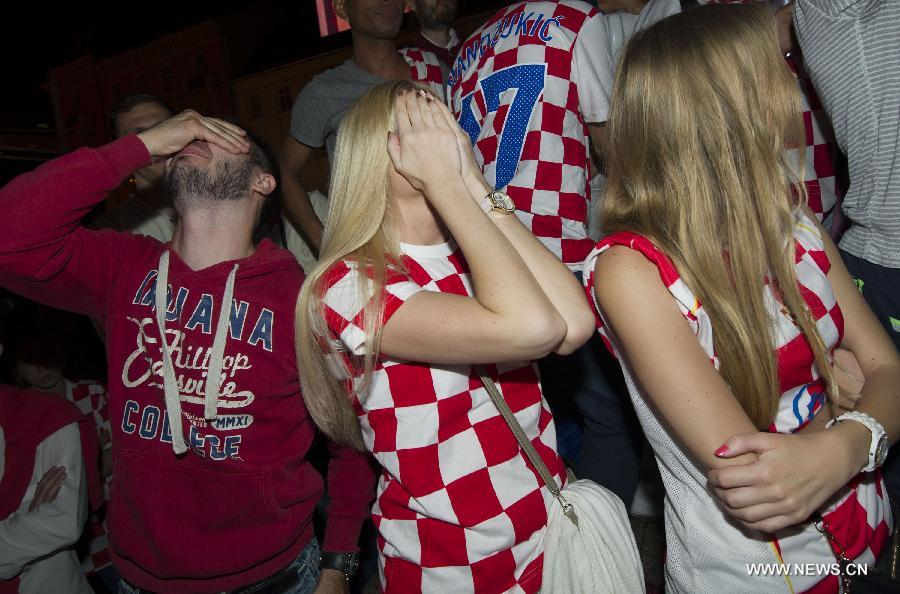 Croatian soccer fans react while watching the televised match between Croatia and Brazil, in Zagreb, Croatia, June 12, 2014. Thousands of fans on Thursday watched the FIFA World Cup opening match on a big screen at Zagreb's central square. (Xinhua/Miso Lisanin)