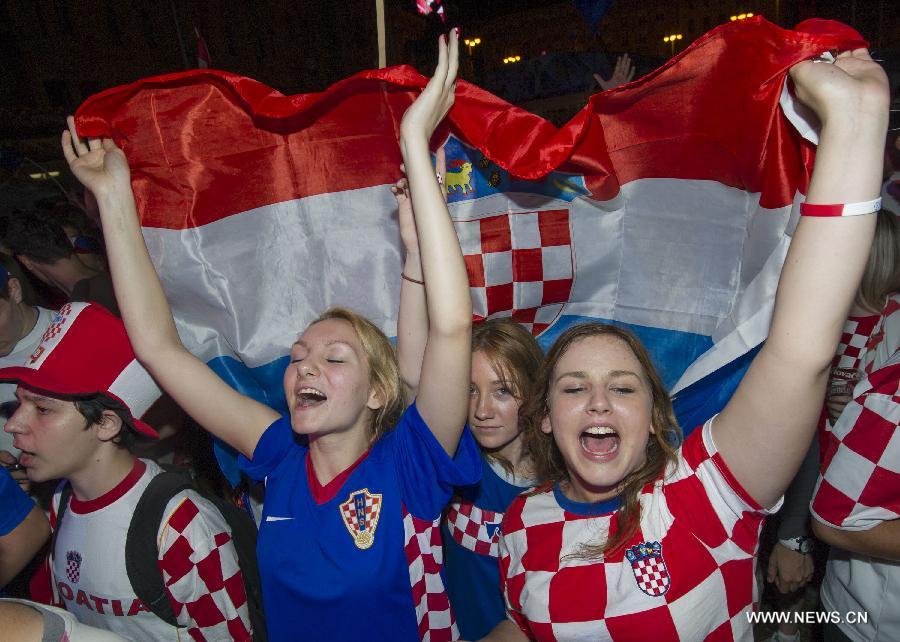 Croatian soccer fans cheer while watching the televised match between Croatia and Brazil, in Zagreb, Croatia, June 12, 2014. Thousands of fans on Thursday watched the FIFA World Cup opening match on a big screen at Zagreb's central square. (Xinhua/Miso Lisanin) |