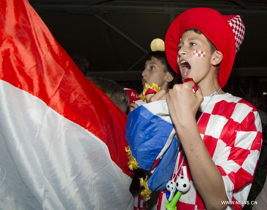 Croatian soccer fans react while watching the televised match between Croatia and Brazil, in Zagreb, Croatia, June 12, 2014. Thousands of fans on Thursday watched the FIFA World Cup opening match on a big screen at Zagreb's central square. (Xinhua/Miso Lisanin) |