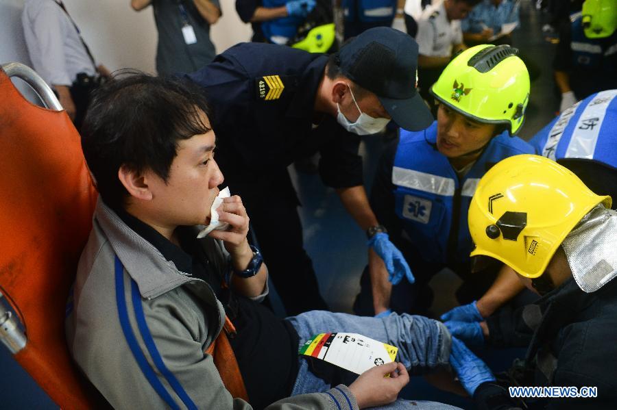 An injured man receives medical treatment at a ferry terminal in Macao, south China, June 13, 2014. A jet cruiser enroute for Macao from Hong Kong crashed the southern embankment at Macao's Outer Harbor terminal on Friday, injuring 61 people. (Xinhua/Cheong Kam Ka) |