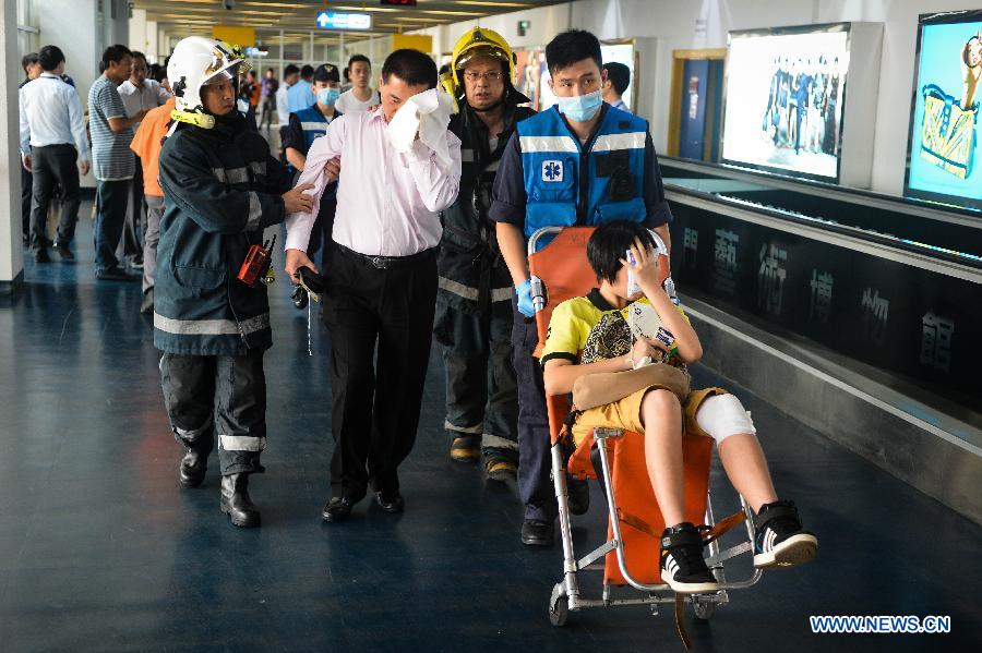 Rescuers transfer injured passengers at a ferry terminal in Macao, south China, June 13, 2014. A jet cruiser enroute for Macao from Hong Kong crashed the southern embankment at Macao's Outer Harbor terminal on Friday, injuring 61 people. (Xinhua/Cheong Kam Ka) |