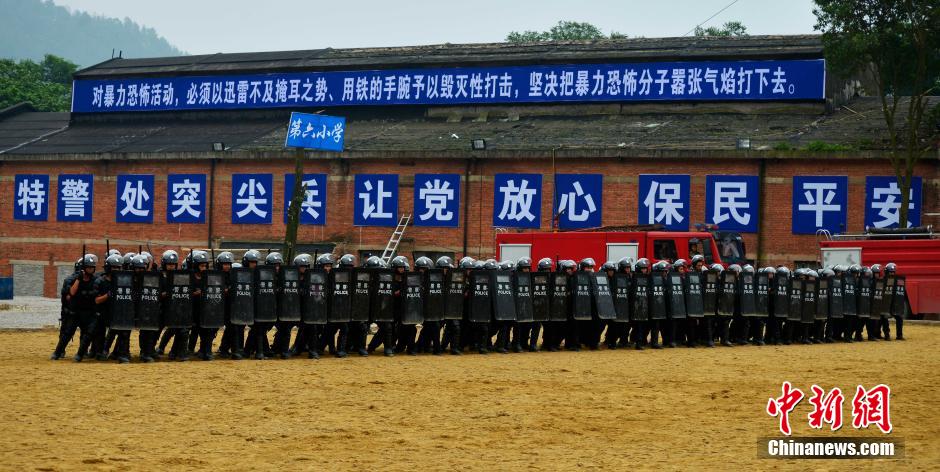 Police in Qiannan Prefecture, southwest China's Guizhou Province, holds a drill to practice anti-terrorism, emergency response and other skills to improve their ability in emergency disposal on June 12, 2014. (Chinanews/Wu Qingyuan)
