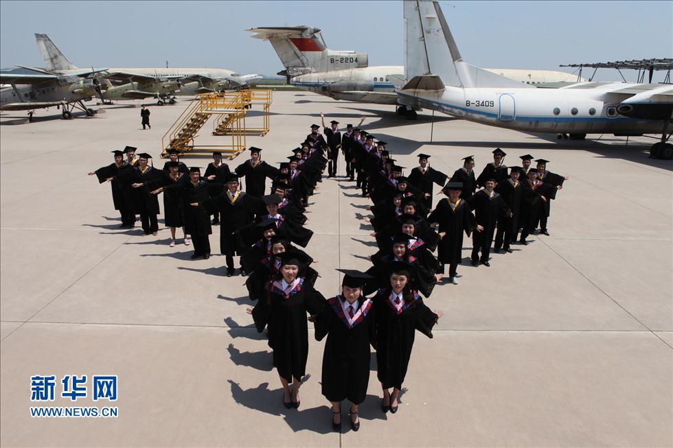 A group of college students from Civil Aviation University of China take photos in front of the large passenger plane, and say goodbye to their colorful college life on June 12, 2014. As college graduation season comes, many graduates are busy having photos taken on campus as a memento. (Pang Jie/Xinhua News Agency)