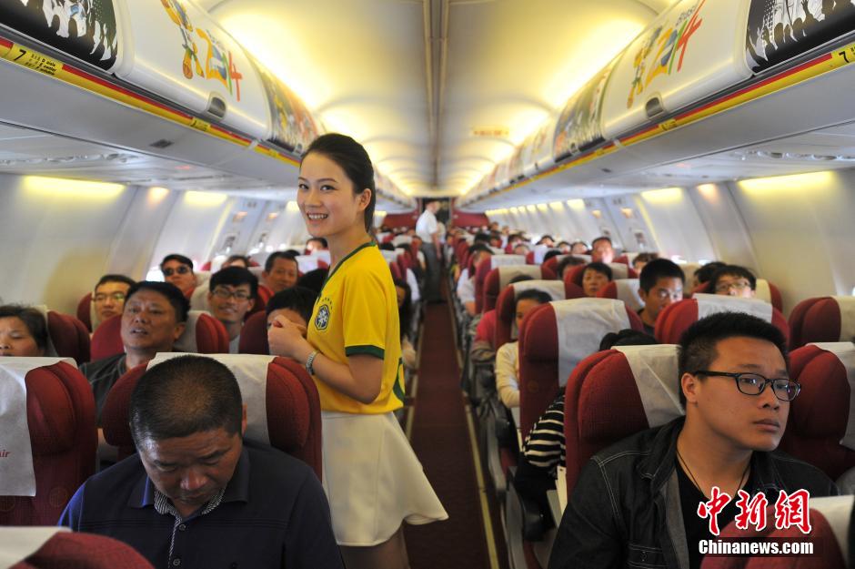 Stewardesses wearing Brazilian soccer team jerseys provide service to passengers on an airline company based in Yunnan province, China. They will provide "World Cup" featured service on its flights during World Cup 2014. [Photo/Chinanews.com]