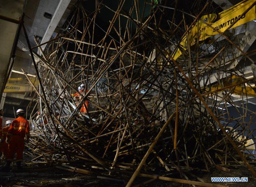 Rescuers work at the site of factory collapse in Yilong New Area of the Bouyei-Miao Autonomous Prefecture of Qianxinan, southwest China's Guizhou Province, June 16, 2014. Five workers have been rescued but four others remain trapped after the collapse of a steel tunnel at the ferroalloy plant here, which occured at 10:20 p.m. on Sunday. The cause of the accident is being investigated. (Xinhua/Liu Yongsong)