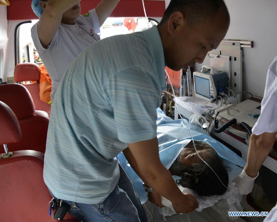 A rescued worker receives medical treatment on an ambulance in Yilong New Area of the Bouyei-Miao Autonomous Prefecture of Qianxinan, southwest China's Guizhou Province, June 16, 2014. Five workers have been rescued but four others remain trapped after the collapse of a steel tunnel at the ferroalloy plant here, which occured at 10:20 p.m. on Sunday. The cause of the accident is being investigated. (Xinhua/Liu Yongsong)