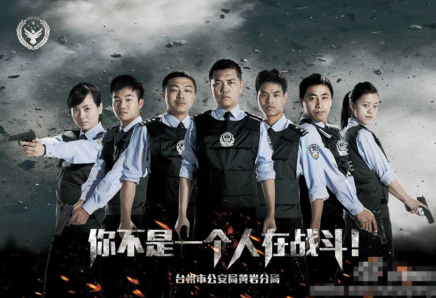 A group of pictures featuring police in Taizhou city, eastern China's Zhejiang Province, have become very popular on the Internet recently because they are similar to the film poster for Hong Kong films. (Photo source: People.com.cn)